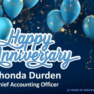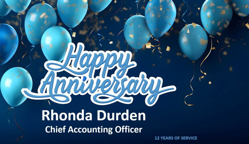 Please help us congratulate the following on their September Anniversaries! Rhonda Durden, Chief Accounting Officer 12 years on September